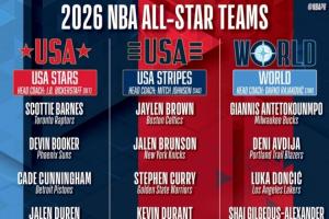 体育资讯02月04日讯 NBA官方公布2025-2026全明星分队结果!其中詹杜库再同队,一众新星组队!世界队9人!