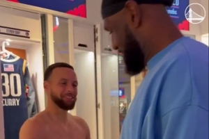 勇士球星库里大受欢迎,他光着膀子和詹姆斯、唐斯和约基奇等人交流。好不容易穿上背心,又与字母哥和东契奇致意。