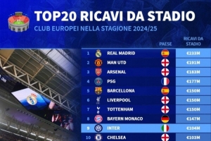 体育资讯2月17日讯 德国转会市场列出了上赛季欧洲俱乐部主场门票收入排名,皇马2.33亿欧居首,曼联1.91亿欧次席。