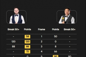 全场比赛,墨菲打出2杆50+和1杆破百,张安达打出单杆90分,最终1-6不敌墨菲,无缘8强。