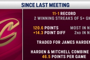 骑士近12场11胜1负,场均得到120.6分,净胜14.3分;哈登&米切尔搭档后,两人场均砍下46.5分。
