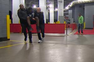 GIF-伊森反击的时候撞到了小文斯·威廉姆斯,小文斯·威廉姆斯被两个工作人员夹着抬回更衣室