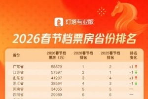 体育资讯2月24日讯 据灯塔专业版数据,广东省2026年春节档票房反超过去蝉联5年的江苏省,继2019年后,再度登顶春节档省份票房榜!