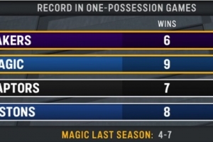 湖人主场迎战魔术,转播方给出一项统计,本赛季一回合定胜负(分差3分以内)的比赛,湖人6胜0负排名第一,魔术9胜3负排名第二。