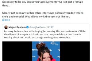 Megan Basham转发了这段视频,并在社媒写道:抱歉,即便抛开背叛这一点不谈,这个女人也糟糕透了。她的傲慢程度简直爆表。不管她拿过多少奖牌,我都找不到任何一点值得我女儿学习的地方。