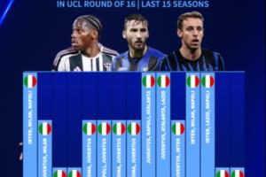 德转统计了近15个赛季欧冠16强意甲球队数↓