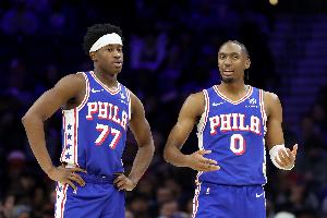 上半场最后一攻,埃奇库姆反击追身三分出手,被身后追防的卡特·布莱恩特撞到失去平衡摔倒,背部着地受伤离场,76人官方随后宣布埃奇库姆背伤不会回归。