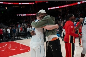 赛后,库明加晒出了与克莱拥抱的照片,并写道:“我的兄弟。”