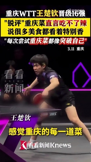 体育资讯03月12日讯 2026年WTT重庆冠军赛男单1/16决赛,王楚钦3-0击败格罗特,顺利晋级16强。赛后他接受采访,谈到重庆的美食。