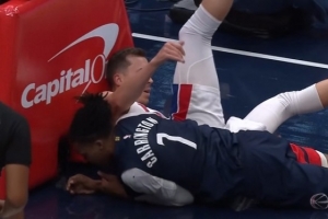 GIF-卡林顿空接暴扣,下来后顺带带倒邓罗,裁判吹邓罗防守犯规后还追加杜伦T;活塞挑战后,又追加卡林顿T