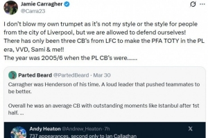 紧接着球迷Parted Beard发文反驳Heaton:“卡拉格就是他那个时代的亨德森。一个嗓门大的领袖,会推着队友变得更好。但总体来说他只是个平庸的中卫,高光时刻只有伊斯坦布尔之夜半场后的大逆转……”