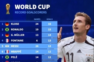 体育资讯4月2日讯 德转列世界杯历史射手榜,克洛泽、大罗前二,梅西和姆巴佩分居第五位和第六位。
