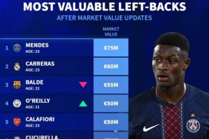 体育资讯4月7日讯 德国转会市场公布了最新的足坛左后卫身价排行榜,其中巴黎圣日耳曼左后卫门德斯以7500万欧元,排名第一。