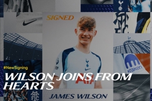 热刺官方写道:“我们非常高兴地宣布,从哈茨租借签下詹姆斯·威尔逊,租期至本赛季结束,并包含在今年夏天将其转为永久转会的买断选项。”