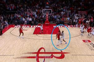 火箭最后一攻边线发球时,小卡紧跟杜兰特,虽然后者借助挡拆甩开伦纳德,但小琼斯及时补防让KD始终没有接到球,最终火箭只能传给伊森强行出手,未能命中。